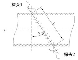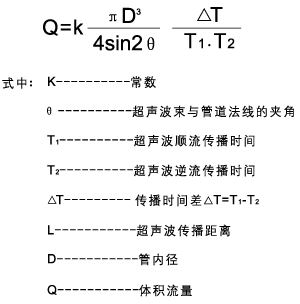 當(dāng)超聲波在液體中傳播時,探頭1發(fā)射的超聲波脈沖被探頭2所接收,同時,探頭2也發(fā)射超聲脈沖,探頭1接收,則順流方向聲波傳播速度會增大,逆流方向則減小,同一傳播距離就有不同的傳播時間,利用傳播時間之差與被測流速之關(guān)系求取流速,進而得出流量,其關(guān)系式如下: |