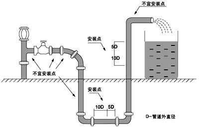 ● 應(yīng)安裝在水平管道較低處和垂直向上處,避免安裝在管道的高點和垂直向下處 |