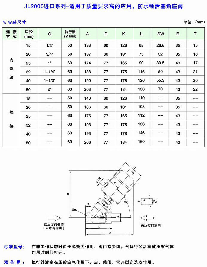JL2000進(jìn)口系列單作用角座閥是我公司的優(yōu)質(zhì)產(chǎn)品之一,在上海JL2000進(jìn)口系列單作用角座閥廠家中享有極高的品質(zhì)聲譽(yù)與服務(wù)評(píng)價(jià).